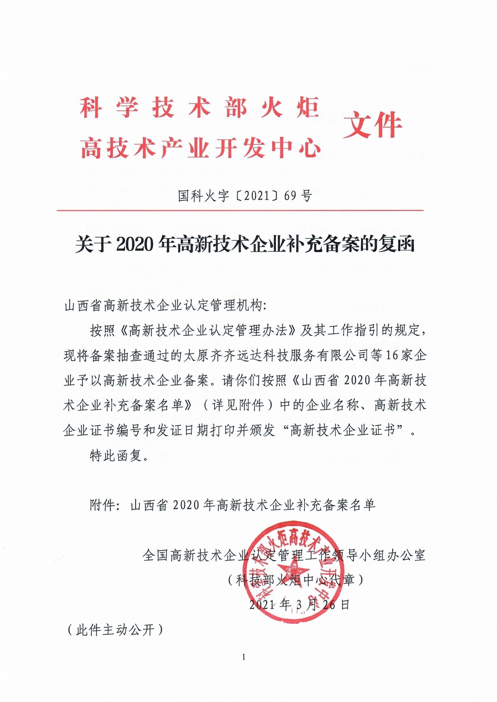 山西關(guān)于2020年高新技術(shù)企業(yè)補(bǔ)充備案的復(fù)函